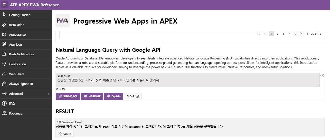 APEX + PWA 연동 예제 및 결과 확인 이미지