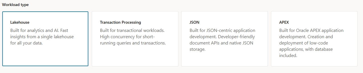 우선 확인한 내용으로는 Free Tier 기준에서도 OCI Autonomous DB 의 Database Configuration 에서 Choose Version 항목에 26ai 로 변경(23ai 미노출), 그리고 Workload type 도 Data Warehouse 에서 Lakehouse 로 변경이 확인 되고 있습니다.